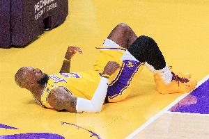 末节詹姆斯在一次反击中被小贾巴里·史密斯犯规放倒,老詹躺在地上表情痛苦。
