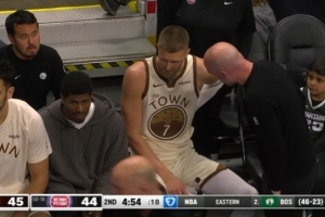 比赛上半场结束,勇士官方宣布,波尔津吉斯(下背部酸痛)本场比赛回归成疑。