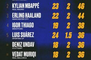 以下为欧洲金靴积分榜排行: