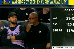 库里出战时勇士23胜16负&缺阵13胜23负 场均得分相差11分