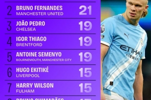 体育资讯3月10日讯 Squawka统计了本赛季英超的参与进球榜(进球+助攻),哈兰德位列第一。