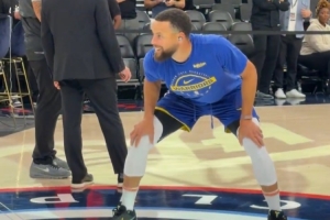 GIF-库里踩着中场Logo投三分 球经过反弹精准命中